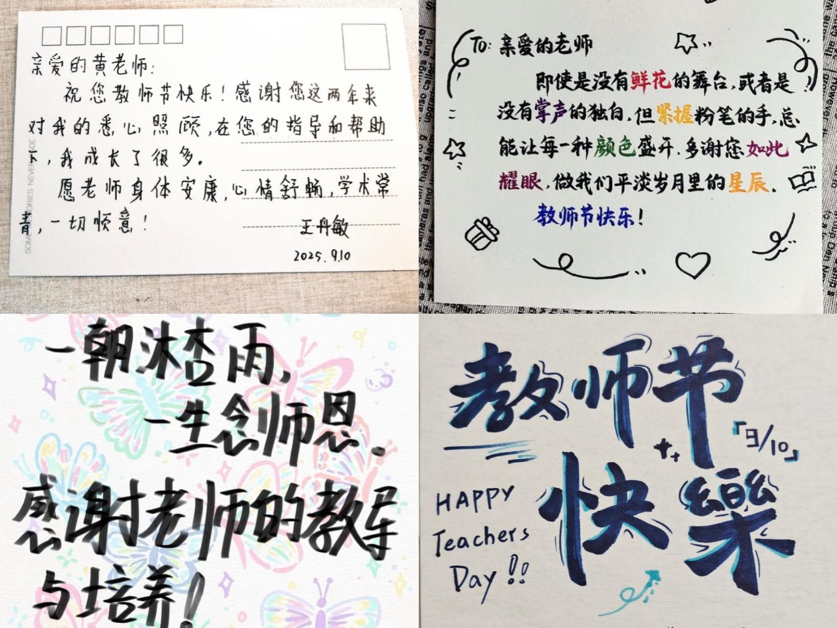 同期展出的“我与我的音乐老师”主题征文及手作贺卡展,则以文字与绘画定格师生间的温情瞬间。自9月初启动以来,活动共收到多篇投稿,学子们用细腻笔触记录琴房里的谆谆指导、迷茫时的暖心鼓励、比赛前的加油呐喊。其中优秀作品被精心设计成手写贺卡,字里行间尽显对恩师的崇敬。
