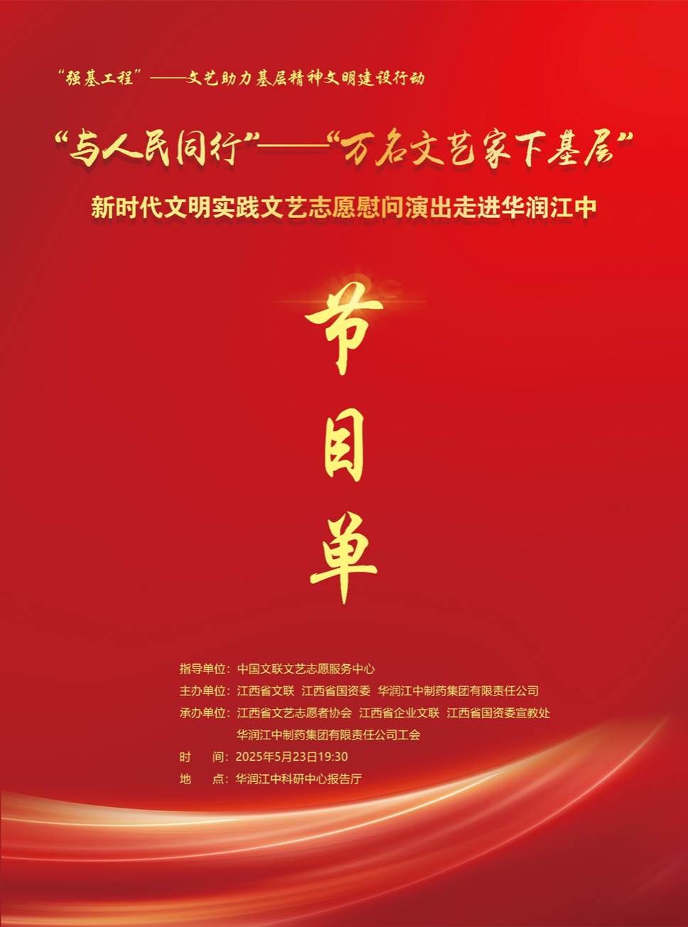 为深入学习贯彻习近平新时代中国特色社会主义思想和党的二十大、二十届三中全会精神,在毛泽东同志《在延安文艺座谈会上的讲话》发表83周年、第12个中国文艺志愿者服务日来临之际,由中国文联文艺志愿服务中心指导,江西省文联、江西省国资委、华润江中制药集团有限责任公司主办的“与人民同行”——“万名文艺家下基层”新时代文明实践文艺志愿服务走进华润江中制药集团有限责任公司慰问演出于2025年5月23日晚19:30在华润江中科研中心报告厅举办。