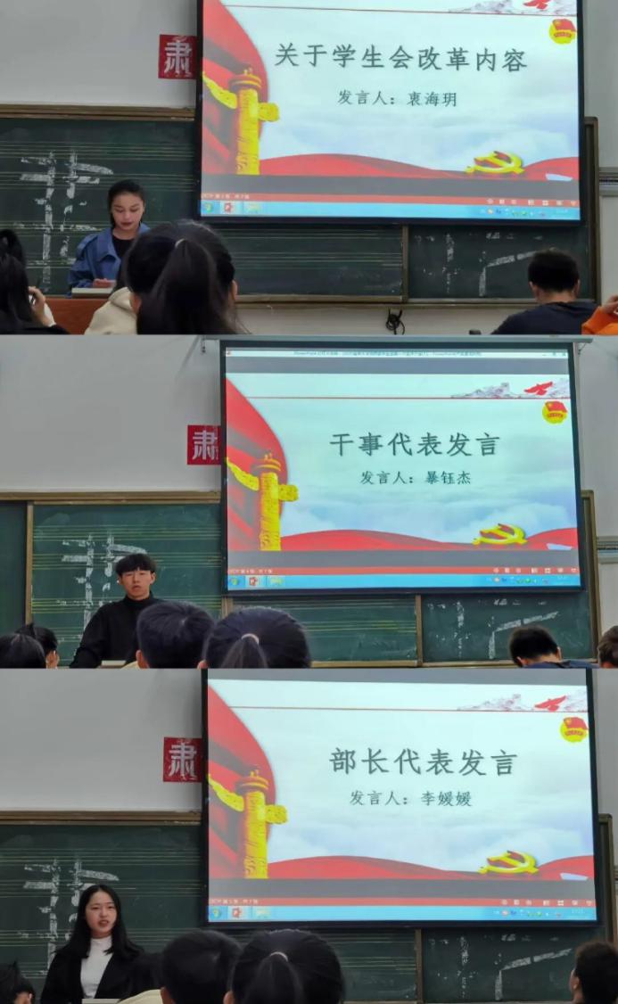 会议在全体与会人员起立高唱《光荣啊,中国共青团》中拉开帷幕。活动部部长衷海玥对学生会深化改革任务进行了分式解读,要求学生会工作人员要明确自身任务,明确改革要求和改革举措,在认识上强化,在责任上压实,在成效上提升,将深化改革落到实处。随后,干事代表暴钰杰上台发言,他代表全体新生干事承诺,将秉承着积极谦逊的工作态度以及以身作则的工作责任,全身心服务于同学。作为部长代表,组织部部长李媛媛结合自身工作经验,向在座新生提出了几点希望,希望大家在学生会工作中严格遵守各项规章制度,合理安排和规划生活,明确自身定位,朝着心中的目标不断奋斗。